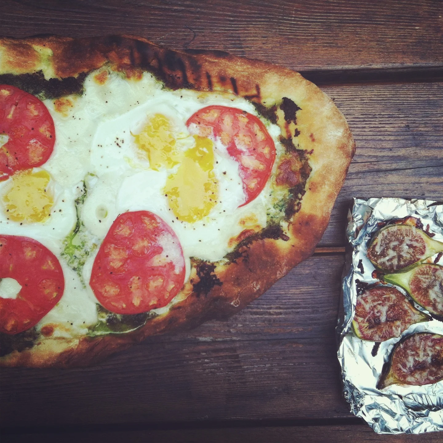 breakfast pizza on the grill: zucchini butter, fresh mozzarella, tomatoes and eggs