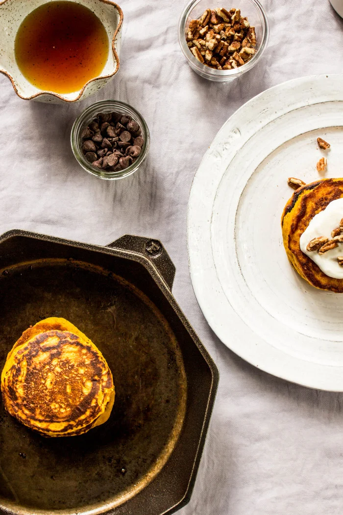 For the recipe, feel free to skip on the balsamic vinegar while roasting. Although, I don't think you should. Adding a bit of vinegar at the end, helps draw out the natural sweetness of the squash. Which in the end creates a sweet, yet slightly savory pancake. I enjoy my pancakes, almost always, with greek yogurt on top. But feel free to drizzle on some good quality maple syrup, a few nuts, and come chocolate chips. I won't judge you.