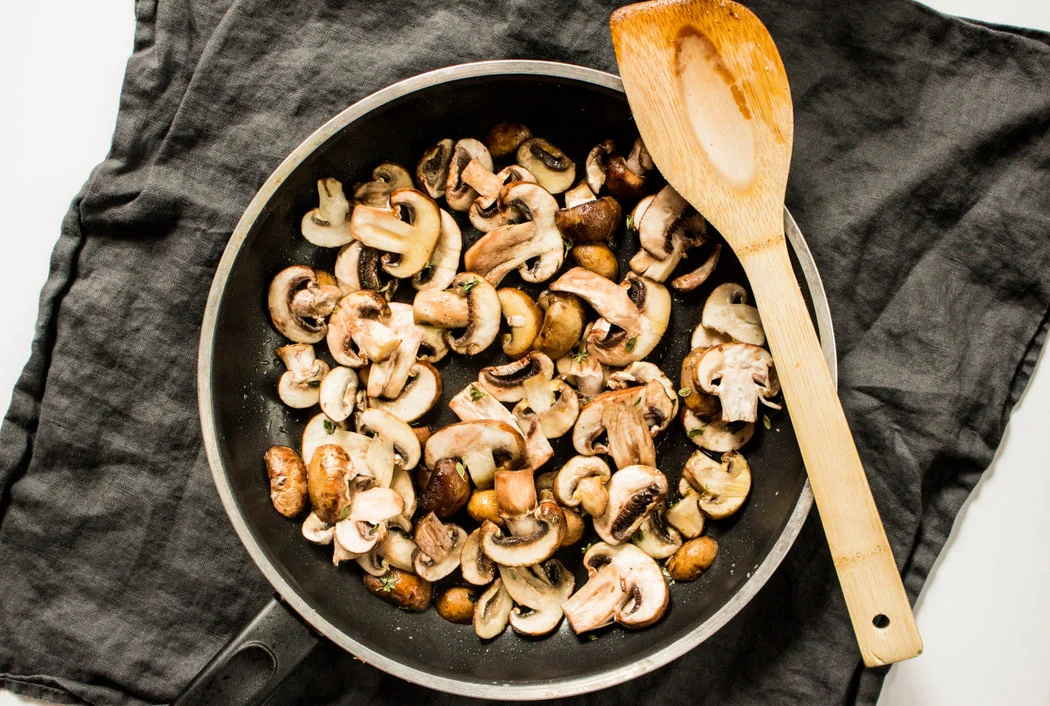 In a medium skillet, heat olive oil over medium heat. Add sliced mushrooms and thyme leaves with a pinch of salt. Stir occasionally for 5-7 minutes, until soft and fragrant.