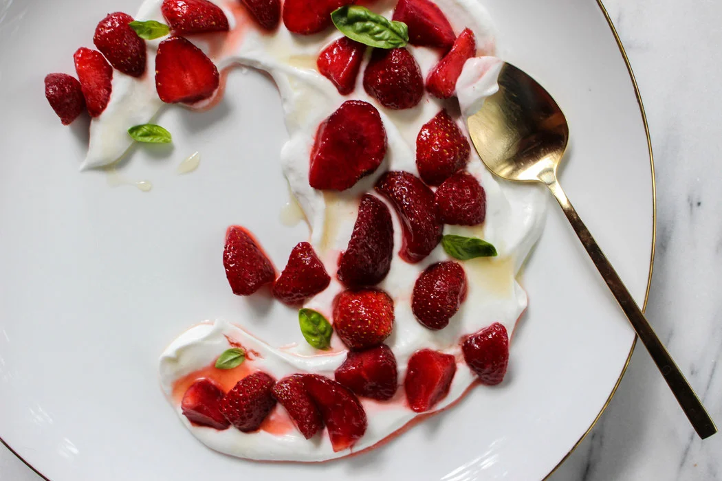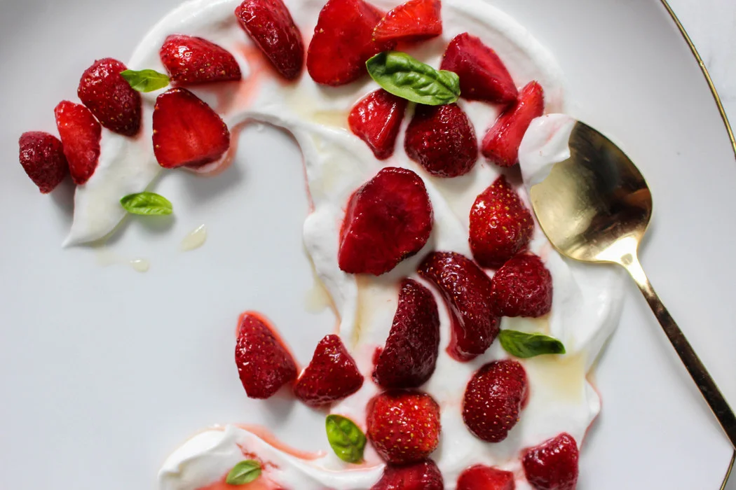 To serve, spread coconut cream over plate or bowl, top with juicy strawberries and basil. Drizzle maple syrup over top with a pinch of flaky sea salt, if desired.