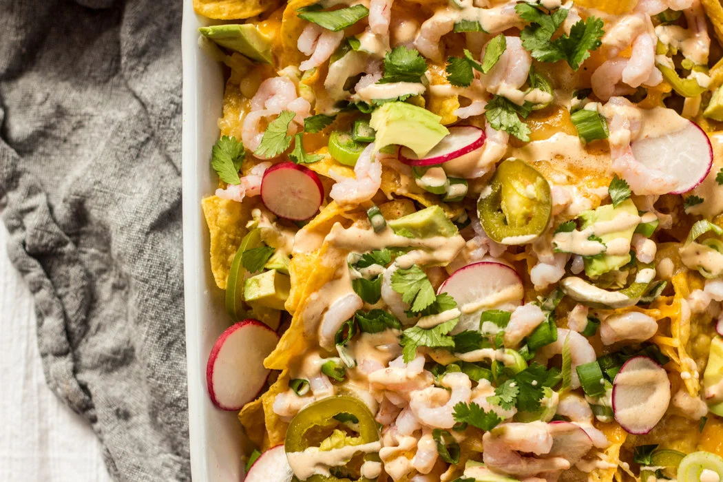 There is a brewery in my area that makes something similar, but with less toppings and instead of shrimp, pulled pork. Which is great. And over the years of going there and loving their nachos I have put together a small list of how to make these nachos, a million different ways. Chicken, of course. Crab, yep, that's really good. And shrimp! And luckily we just returned back from the Oregon Coast, for a quick getaway, with a car full of smoked salmon, a few crabs and these bay shrimp. Topped with the worlds best chips, lots of radishes, avocado, cilantro, super spicy pickled jalapenos and chipotle crema. These nachos are the bee's knees.