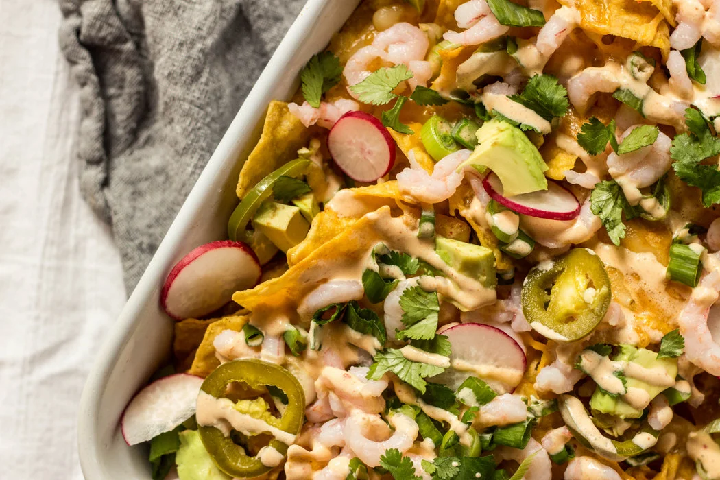Spicy Shrimp Nachos with Chipotle Crema + Pickled Jalapenos