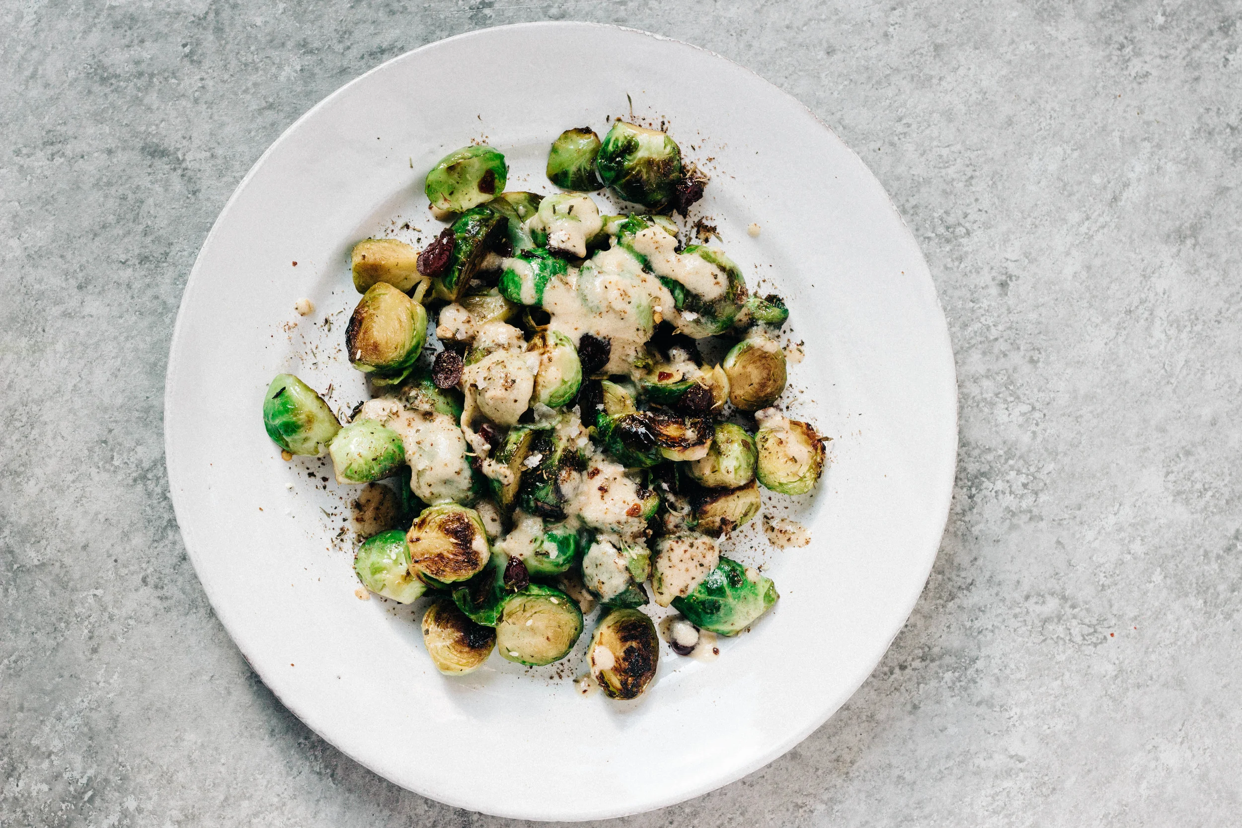 Roasted Brussels Sprouts with Cranberries, Tahini + Sumac