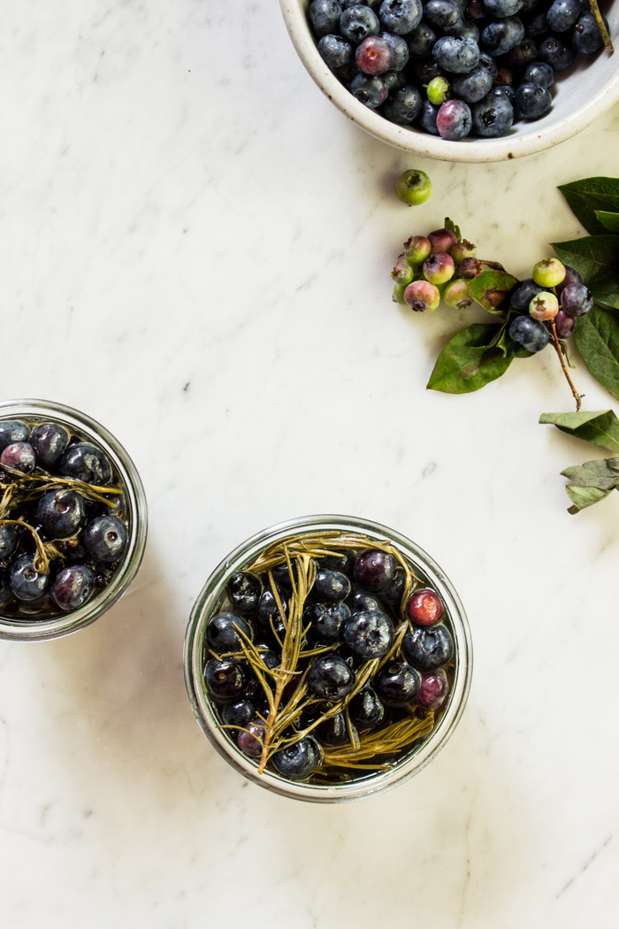 Rinse blueberries and fill jars. Pour brine mixture over blueberries, covering them completely, making sure to divide herbs into each jar. Seal and let cool on counter top. Once cool, keep in refrigerator for up to 2 weeks.