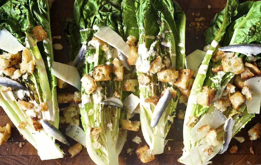 Grilled Romaine with Caesar, Focaccia Croutons, and Anchovies