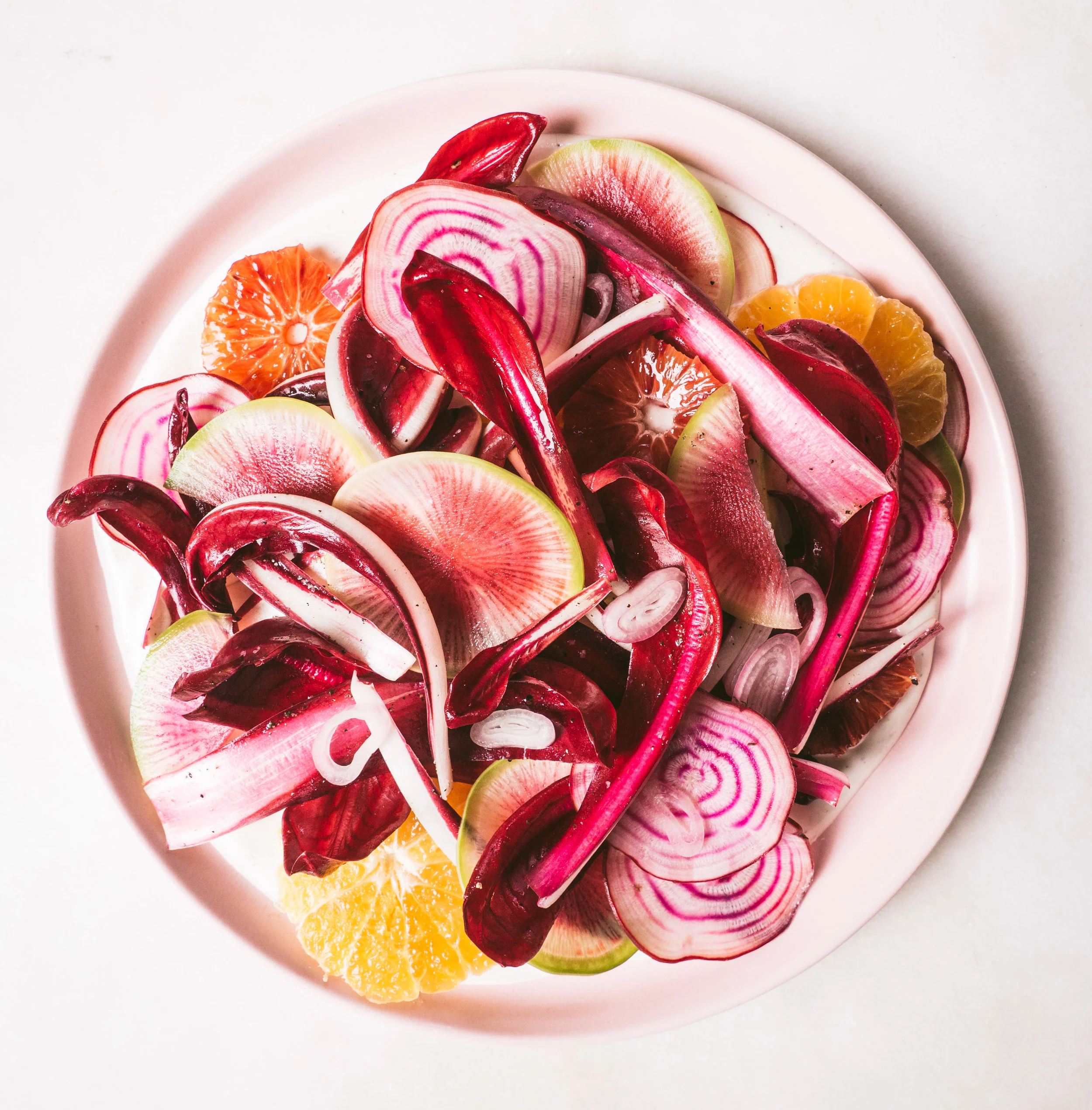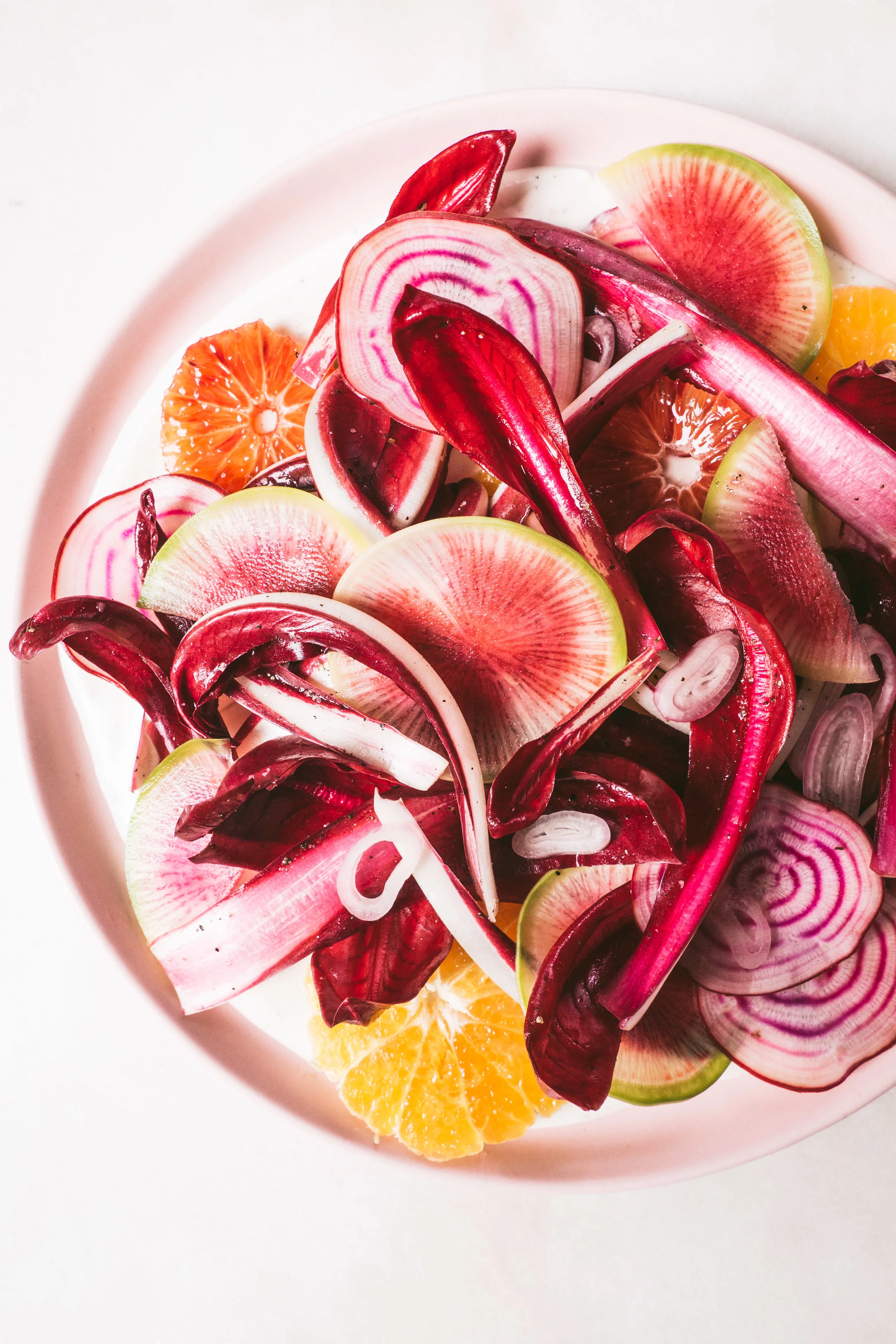 Add the endive to the vinegar and shallot bowl and toss together. Season salt and pepper. Mix in the radishes, and citrus and add the olive oil, gently tossing together.